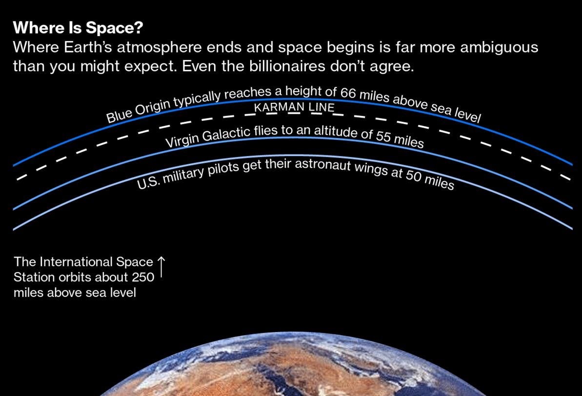 Bezos is adamant that space begins at the internationally recognized Karman line some 62 miles (100 kilometers) above sea level. Blue Origin typically reaches an apogee of around 66 miles. By contrast, Virgin Galactic flies to an altitude of around 55 miles, thereby surpassing the 50-mile mark at which U.S. military pilots are awarded their astronaut wings.