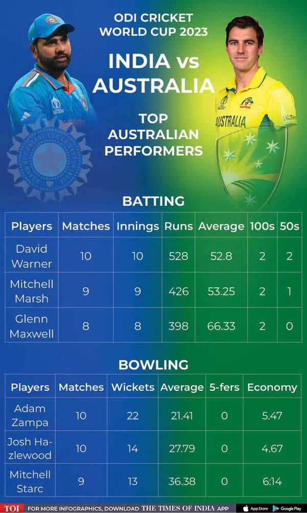 David Warner, Mitchell Marsh, and Travis Head have been the architects of Australia's success, known for their rapid switch of gears and fearless batting. Warner, Australia's highest run-getter in the tournament, Marsh, and the in-form Head form a formidable trio that can lead a brutal assault. Indian pacers Bumrah, Siraj, and the unplayable Shami hold the key to stopping this power-packed trio. If India can remove Marsh, Warner, and Head early, Australia will be under immense pressure.